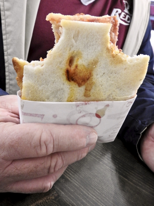 気に入ったピザを指差すと、お店の人がナイフを動かしながら、「これぐらい?」と切り分ける大きさを聞いてきますから、こちらも「もっと大きく」とか「もっと小さく」とジェスチャーで好みの大きにしてもらいます。ピザの値段は重さで決まります。お金を払うと、温めてくれて、食べやすいように二つ折りにして出してくれます。