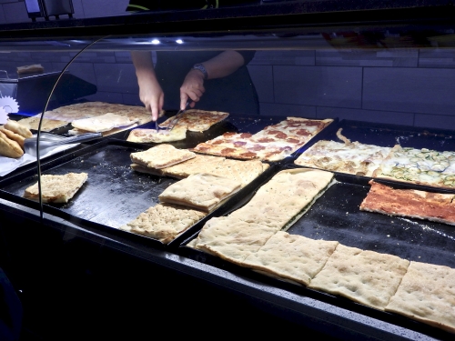 イタリアのピザ屋さんは、日本のピザ屋さんのようなピザを提供してくれる本格的なピッツェリア(Pizzeria)と、大きなピザを切り売りしてくれるピッツァ・アル・ターリオ(Pizza al taglio)がありますが、このお店は後者。ローマでもよく見かけますよね。