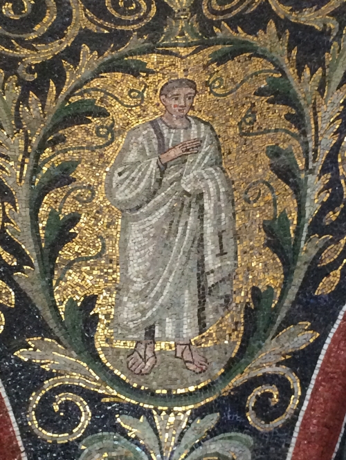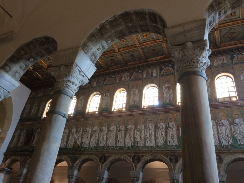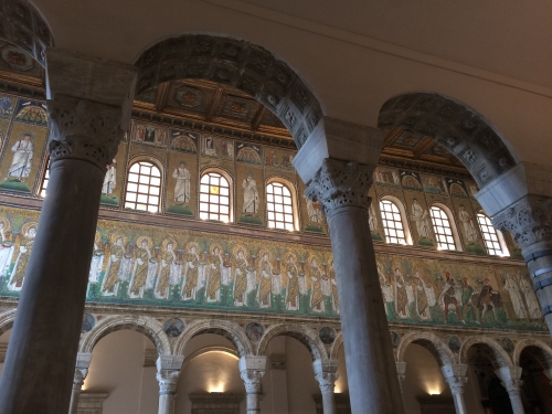 ラヴェンナ駅の近くに位置するこちらの聖堂は、内部に入ると、正面に向かって左側に「22人の聖女」、右側に「26人の殉教者」のモザイク画がズラリと並んでいて圧巻です。