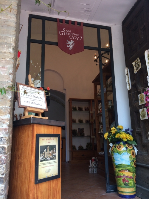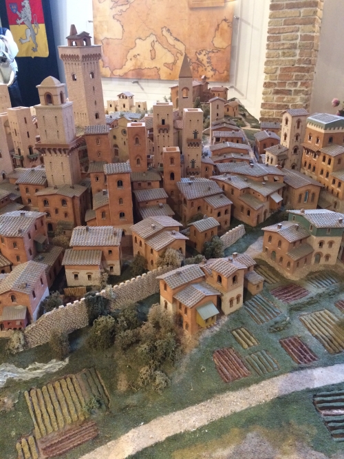 ここには、1300年代のサンジミニャーノの街の姿を再現したミニチュア模型が展示されています。最盛期の塔の数の多さに驚くとともに、塔の数が減ったとはいえ、700年以上前と街並みがほぼ変わっていないことにも驚かされます。またここは、地元のお土産品を買うことができる場所でもあります。