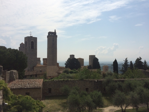 「美しき塔の街」と呼ばれるサンジミニャーノは、13世紀から14世紀頃にかけて富と権力の誇示のために町中で競い合って高い塔が建てられたそうです。最盛期には70以上あった塔もだんだんとなくなり、今では14の塔が残っているのみです。