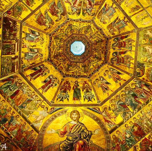 内部は特に、「最後の審判」や聖書に登場するシーンを描いたクーポラ(天井)のモザイク画が美しいことで有名です。この洗礼堂の見どころの一つ・東扉は、ミケランジェロが「天国の門」と賞賛したと言われています。