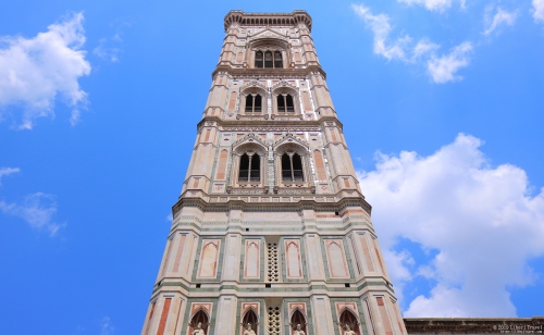 「ジョットの鐘楼(Campanile di Giotto)」は、サンタ・マリア・デル・フィオーレ大聖堂(ドゥオモ)の隣に建設された鐘楼です。塔内部には約400段の狭い階段が続いており、塔の頂上からは、カメラにおさまらないほど大きな赤いクーポラを間近に見ることができます。