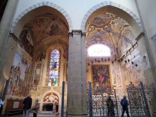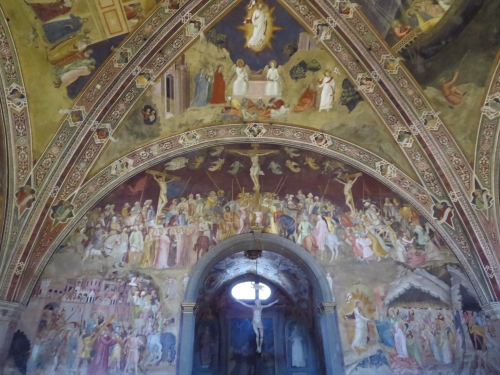 こじんまりとした外観ですが、内部は色彩豊か。壁・床・天井は、装飾壁で彩られています。これがルネサンス様式の特徴です。回廊のあらゆる場所にもキリストが掲げられ、上下左右見渡す場所のほとんどが、装飾されています。