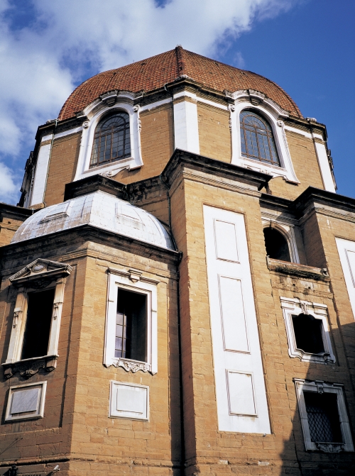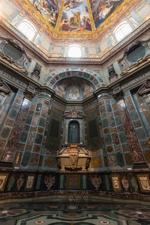 「君主の礼拝堂」は、メディチ家出身で代々のトスカーナ大公とその家族が眠るお墓。8角形建物は、幅28m、高さ59m。フィレンツェではドゥオーモの丸屋根に続いて、2番目の大きさを誇ります。数百種類にも及ぶといわれている色彩豊富な大理石と貴石が贅沢にあしらわれた豪華な空間は、一見の価値ありです!