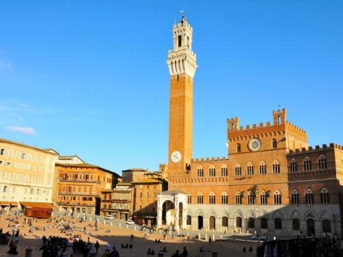 小高い丘に築かれた旧市街地は「シエナ歴史地区」として1995年にイタリアの世界遺産にも登録。歴史地区の主な見どころは、世界一美しいと称される「カンポ広場」や、広場の目の前にそびえたつ高さ88mの「マンジャの塔」、真っ白に輝くファサードが眩しい「シエナ大聖堂(ドゥオモ)」などが挙げられます。