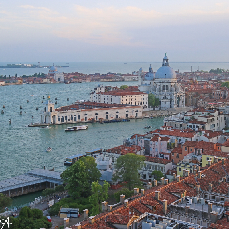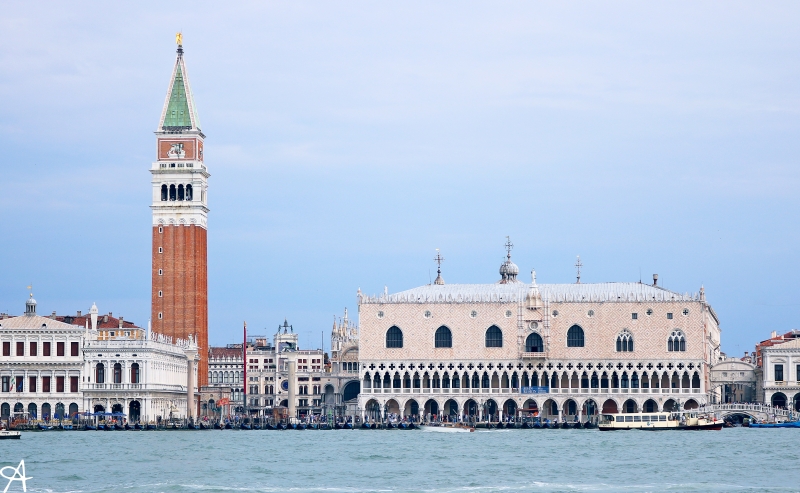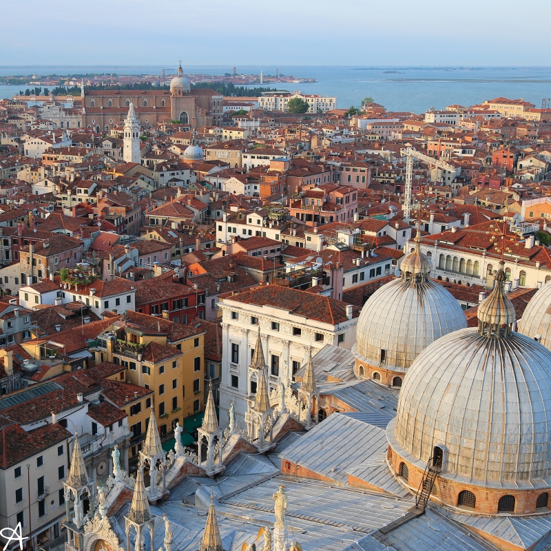 【1】でご紹介したサン・マルコ広場にあります。この鐘楼に登って、頂上からベネチアの街を一望することができます。ベネチアは細い道ばかりなので、高いところから撮影すると、隙間なく建物が建っているような写真を撮ることができます。南側は、ベネチアがたくさんの島から成り立っていることが伝わる写真が撮れます。