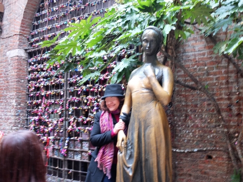 ロミオがよじ登ったバルコニーは予約制です。この中庭にあるジュリエット像の右の胸を触ると、幸せになると言われているので、右胸だけピカピカに光り輝いています。