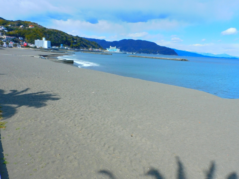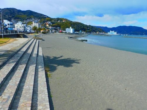 伊東温泉の温泉街から徒歩で行けるビーチで、宿から水着姿で気軽に訪れる事ができます。青い海と風に揺れるヤシの木が南国ムードを演出してくれています。