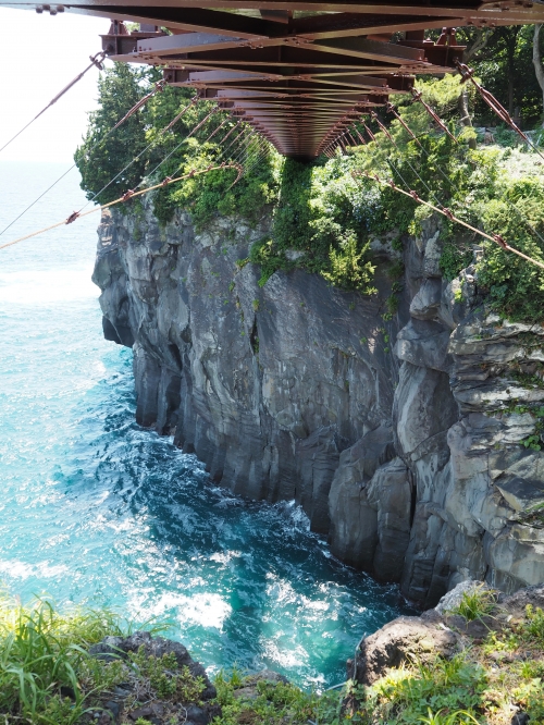城ヶ崎ピクニカルコースの中間にある、全長48m、幅1.5m、高さは23mの吊り橋からの眺めはスリル満点。ですが、定員は100名と割と大きくて頑丈な吊り橋なので、揺れて怖いという感覚はありません。