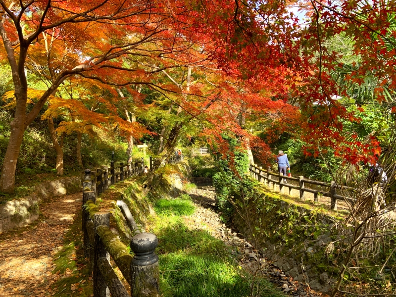 小さな谷の両側にモミジが植えられており、晩秋の頃に真っ赤に染まります。週末を中心に多くの観光客が訪れ、紅葉の最盛期には、駐車場が満車になるほどです。
