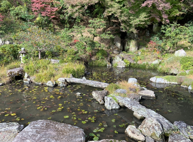 こちらは、名草御殿のそばにある庭園です。裏山に沿うように配置された池、季節ごとに変わる斜面の植物など、風情が感じられます。筆者が訪れた際には、紅葉がまだ進んでいませんでしたが、紅葉するとさらに美しく感じられそうでした。