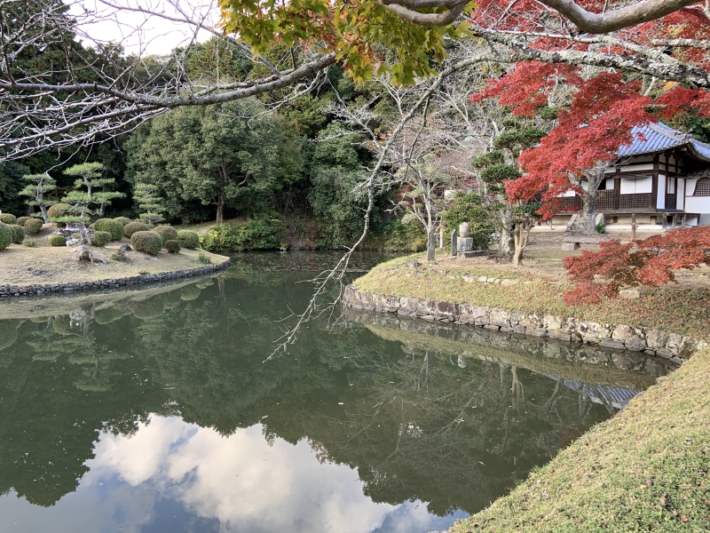 根来寺庭園の一部である聖天池には、橋が渡された中島があり、こちらの景観も美しいです。すぐ南に蓮池があり、初夏には蓮の花が見られるそうです。