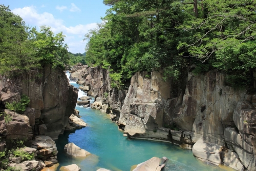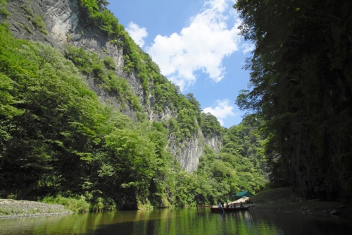 猊鼻渓(げいびけい)とは、岩手県一関を流れる北上川の支流・砂鉄川にできた全長2kmほどの渓谷。高さ100mを超す迫力ある岸壁の間を、澄んだ川がゆったりと流れています。