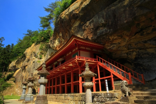 征夷大将軍であった坂上田村麻呂が蝦夷を討伐した際に、毘沙門天のご加護に感謝し建立したと言われており、境内全域が国の史跡に指定されています。切り立った岩壁にくっつくように建つ毘沙門堂が印象的。そしてこの毘沙門堂に向かって左側の岩壁に目をやると、そこには崖に彫刻された「岩面大仏」が。桜や紅葉の季節に合わせて訪れるのもおすすめです。