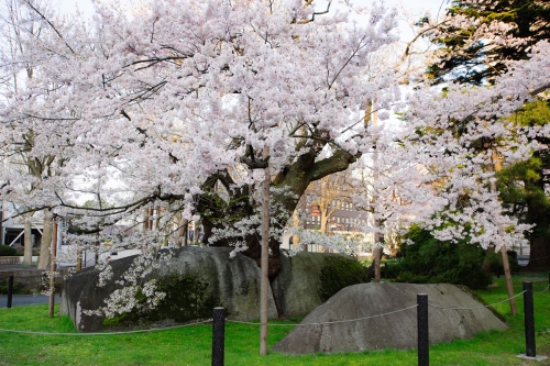 盛岡藩の家老であった北家の屋敷跡(現・盛岡地方裁判所)の前にある、周囲21mの花崗岩の割れ目から育ったエドヒガンザクラです。庭石の割れ目に偶然桜の種が飛んできて芽を出し、成長とともに石の割れ目を押し広げていって出来たものと言われています。