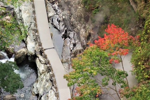 全長約8kmのV字渓谷は、周辺の断崖から温泉の蒸気が何箇所も吹き出す「大噴湯(だいふんとう)」が有名です。遊歩道に向けて、轟音を響かせ、勢いよく蒸気が噴き出すさまは、別名「地獄釜」と呼ばれるのも納得の迫力です。遊歩道周辺は蒸気のせいか草木が少ないので、紅葉は川原湯橋から見下ろした方が楽しめます。