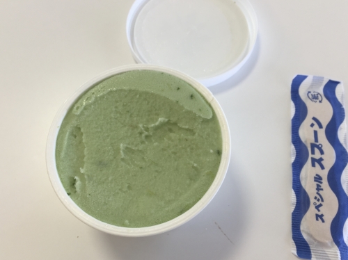 アシタバとアイスクリームって正直どうなんだろうと思いましたが、せっかくなのでチャレンジしてみることに。カップの蓋を開けると見事にアイス全体がアシタバの緑色。