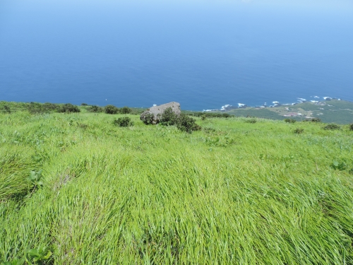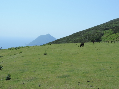 八丈富士の7合目付近にひろがる牧場で、ジャージー牛が放牧されています。