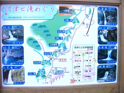 文字通り河津町を流れる「河津川」にかかる7つの滝の総称です。約1.5kmの間に大滝、出会滝、カニ滝、初景滝、蛇滝、エビ滝、鎌滝の滝がかかっています。