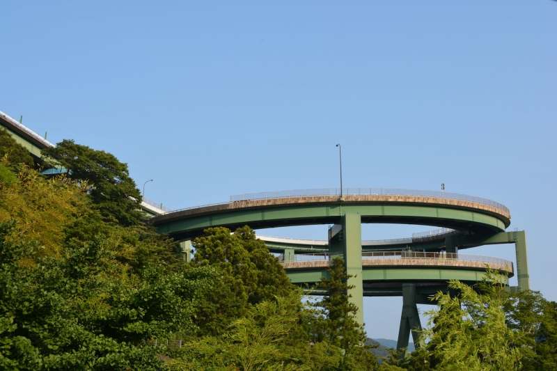 高低差が45mもあることで有名な「河津七滝(かわずななだる)ループ橋」。1,064mの道路を、グルグルっと2回転しながら上り坂は反時計回り、下り坂は時計回りで走行します。その直径はなんと80m!なかなか想像できないかもしれませんが、国内では珍しいスリルのある大きなループ橋です。