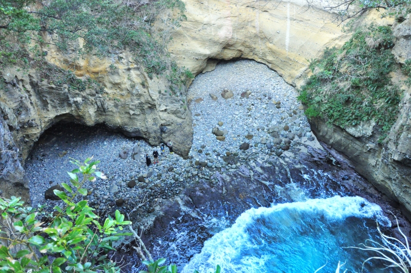 透明度が高く真っ青な海が印象的な、田牛海水浴場のすぐそばにある洞窟「龍宮窟(りゅうぐうくつ)」。波の侵食によってできた洞窟「海食洞」の天井が崩れ、直径約40mの天窓が開いたものです。洞窟の中に入れば頭上にはぐるりと青空が見渡せ、海に面した正面には窓のような穴がぽっかりと開いており、南伊豆の穏やかな青い海を望むことができます。