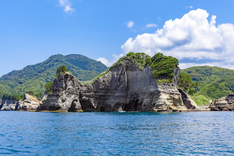 その美しさから“伊豆の松島”とも称される景勝地「堂ヶ島」。リアス式の海岸線が続き、波の浸食によってできた島々が海に点在している景色で多くの人を魅了しています。