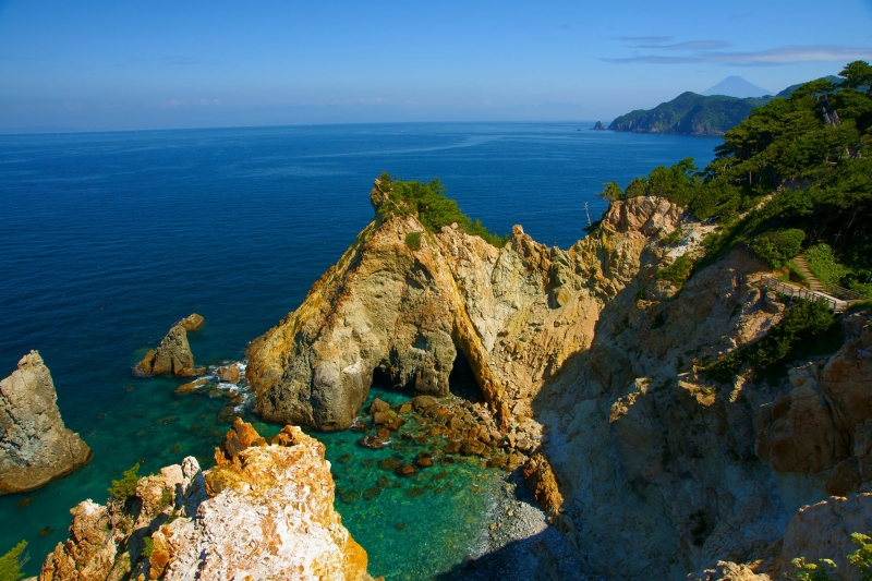 夕日に照らされると、岩肌が黄金色に輝くことに名前が由来している「黄金崎」。駿河湾と富士山を同時に望める眺望のすばらしさと夕刻時の景観の美しさから、伊豆が誇る景勝地の一つとなっており、日本の奇岩百景にも認定されています。