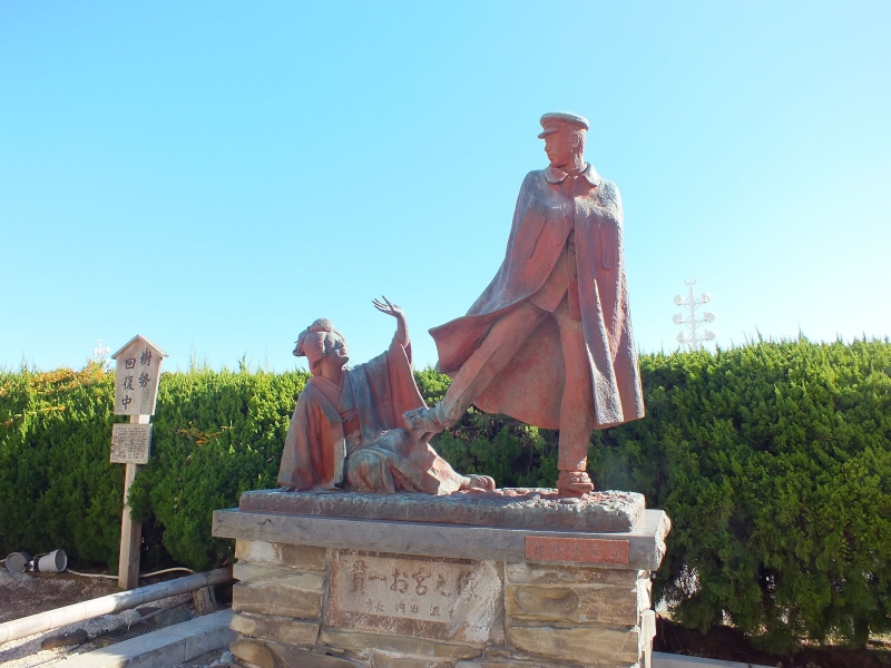 熱海サンビーチにある、尾崎紅葉の小説『金色夜叉』に出てくる貫一とお宮の銅像。貫一とお宮のカップルは、お宮が両親の強い勧めで富豪と結婚させられ、無理やり引き裂かれます。お宮はその理由を貫一に説明できず、悲しみ憤った貫一はお宮を蹴飛ばす、というクライマックスシーンを再現したもの。近くには「お宮の松」もあります。