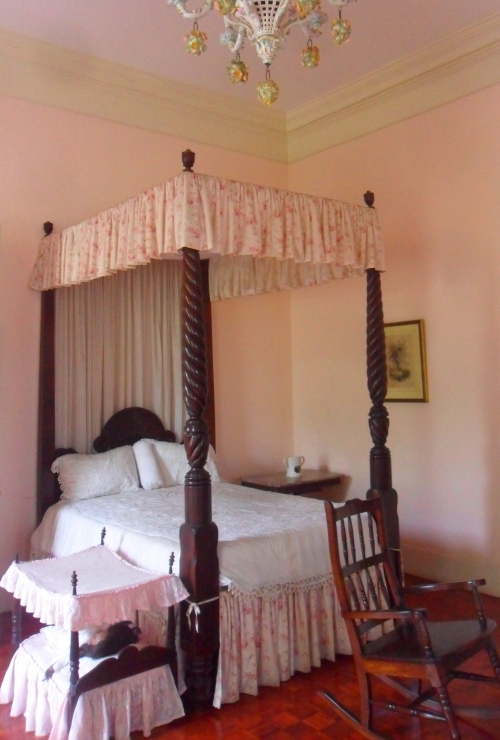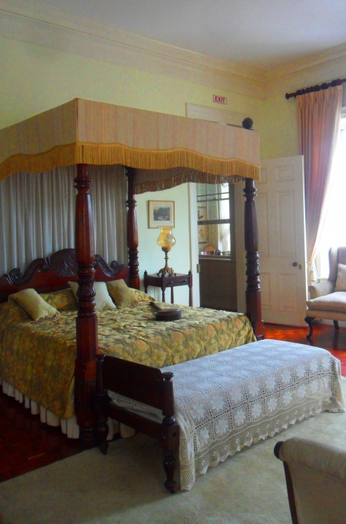 マホガニーでしょうか。とても太くて黒光りのする木が使われていて、目を奪われます。まるでヨーロッパのお城に置いてありそうな天蓋付きベッド。