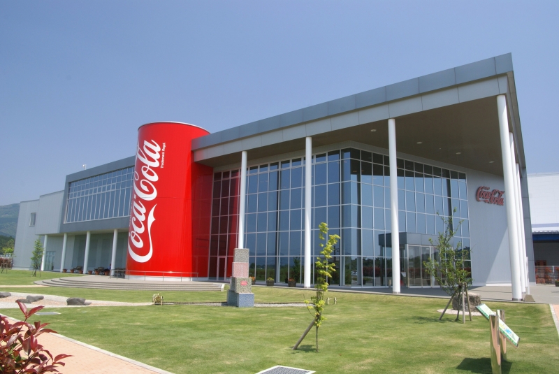 コカ・コーラ社製品の工場。工場の2階にある自由見学エリアでは、小型ペットボトル無菌充填ラインを窓越しで見学することができます(要予約)。