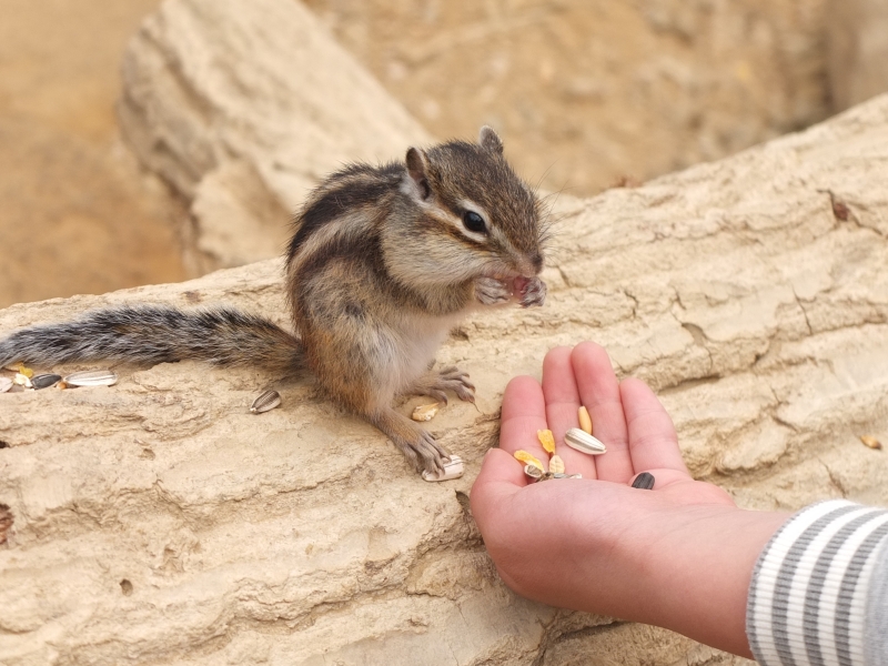 入園の際、100円でひまわりの種やナッツなどが入っている餌を購入でき、餌を持っていると、愛らしいリスたちが近寄ってきてくれますよ。