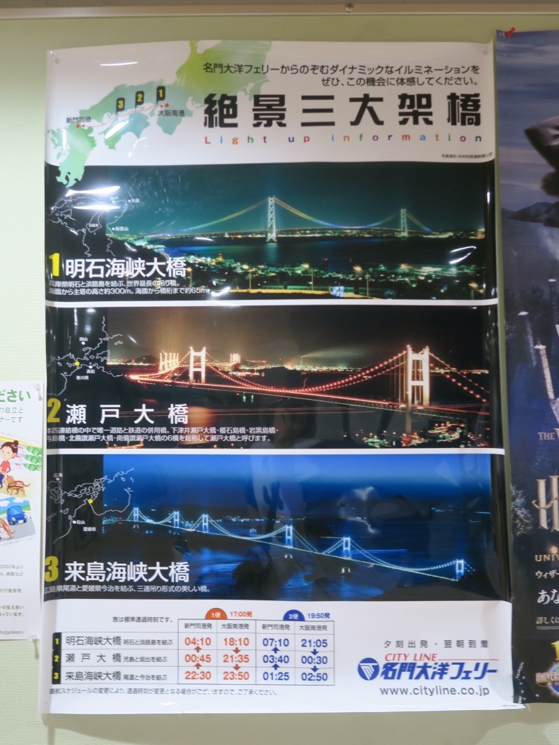 筆者が利用した名門太洋フェリーでは、各橋の通過時間が掲示物などで表示されていた他、船内アナウンスもありました。