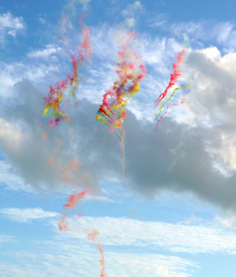 夜の花火のような、きらびやかで迫力のある光や音の世界とはまた違い、静かに色煙が空に揺らめくその姿は、とても情感にあふれた世界です。この昼花火だけでも、「大曲の花火」の花火を見に行く価値はあると思います。