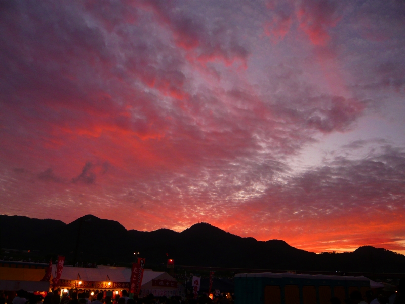 昼花火から夜花火の部が開催されるまで、約35分の間があります。天気がよければ、とても美しい夕日を見る事ができます。都会から離れた自然の中で見る花火はまた格別です。都内からですと遠方になりますので、桟敷(さじき)席付きのツアーなどに申し込むと便利です。