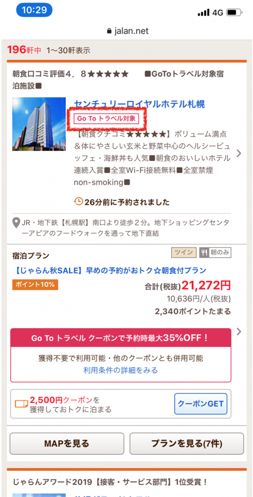 じゃらんの場合、対象宿はその宿の個別ページと、宿・ホテル一覧上で「Go To トラベル対象」と表示されているので、その表示で判別できます。