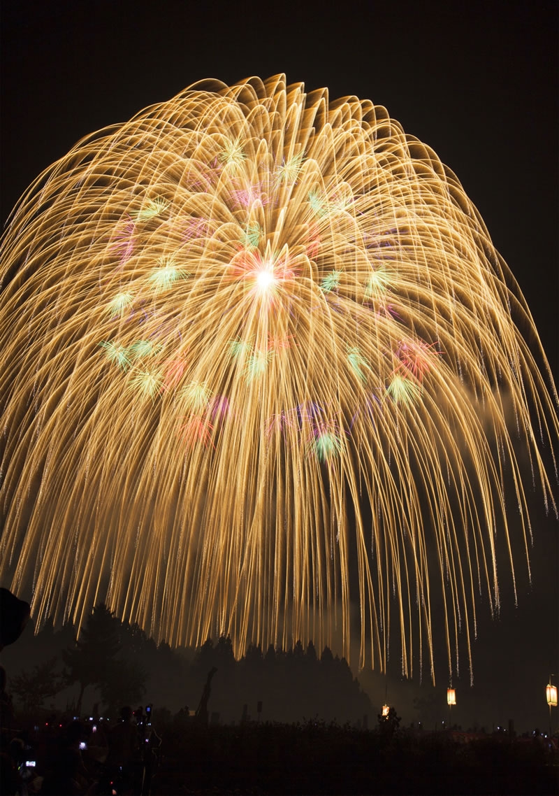 打ち上げ数は二日間あわせて15,000発、20万人ほどの人出。見どころはなんと言っても、夜空に直径800mの大輪の花が咲く、世界最大の四尺玉です。この四尺玉は両日の22時頃に打ち上げられます。