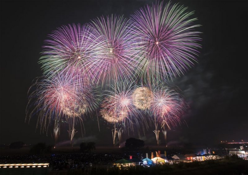 日本三大花火のひとつで、1925年(大正14年)より開催されている歴史ある花火競技大会です。全国の煙火業者60社ほどが自慢の技を競い合う日本屈指の大会で、打ち上げ数は競技花火と余興花火合わせて約20,000発。人出は70万人というから驚きです。