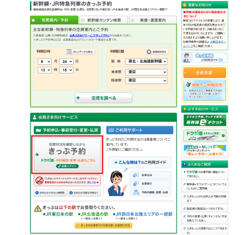 出典:www.eki-net.comえきねっと切符予約トップ画面 「きっぷ予約」をクリック(公式サイトのスクリーンショット)