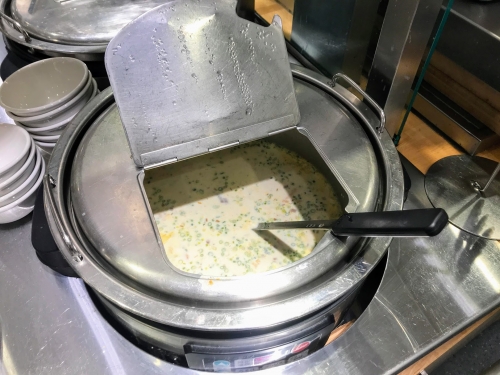 パンやスープもあるので、モーニングにも最適です。スープは3種類あり、こちらのサーモンチャウダーは1杯399円でした。ちなみにコーンスープは1杯199円で食べることができましたよ。