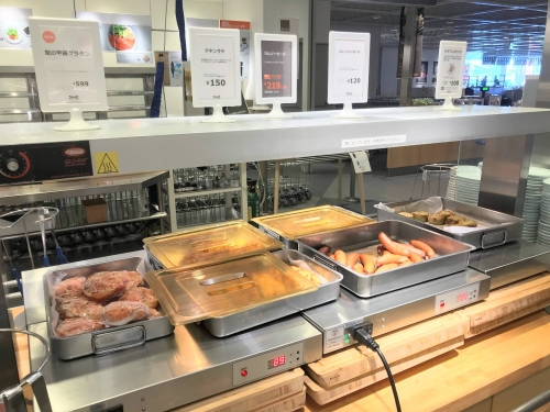 カートを準備したら、料理を選んでいきましょう。ディスプレイされている料理の中から好きなものを好きなだけ取ることができます。それぞれの値段もそばに書いてあるので、安心です。おかずだけでなく、スイーツ類も充実してますよ。