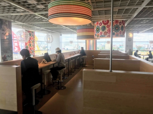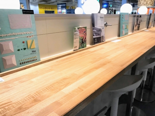 IKEAレストランには通常のテーブルだけでなく、写真のようにカウンター席や、電源が設置されている区画もあり、まるでカフェさながらの雰囲気。現にここでパソコン作業をしていた方もおり、IKEAを訪れている目的は家具を見ることではなく、このレストランなのでは?と思ってしまったほどです。