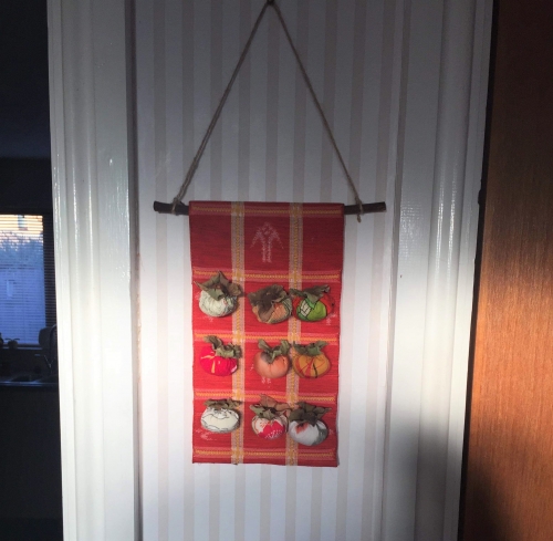• 写真:Noz干し柿をイメージした手芸のタペストリー。ハロウィーン以外の秋のインテリア用品は、海外では意外と珍しい!
