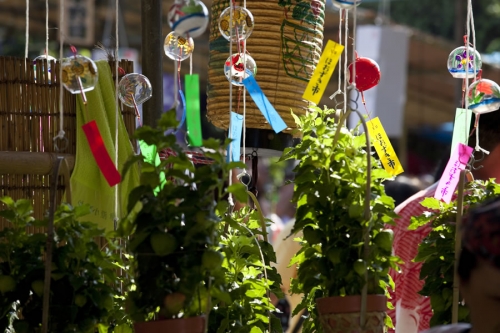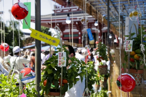 ほおずき市ではほおずきとあわせて風鈴も販売されており、露店のあちらこちらにたくさんの風鈴が吊り下げられています。浴衣を来た女性たちも多く訪れ、賑やかな日本の夏を感じることができるイベントです。
