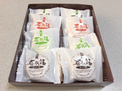 今回は、喜久福4種詰合せ8ヶ入り(1,028円:税込)を紹介します。4種詰合せ8ヶ入りには、生クリーム、抹茶、ほうじ茶生クリーム、ずんだ生クリームがそれぞれ2個ずつ入っています。4種詰合せだけでなく、1種詰合せや2種詰合せもあるので、お好みの味を選んでお取り寄せすることもできますよ。