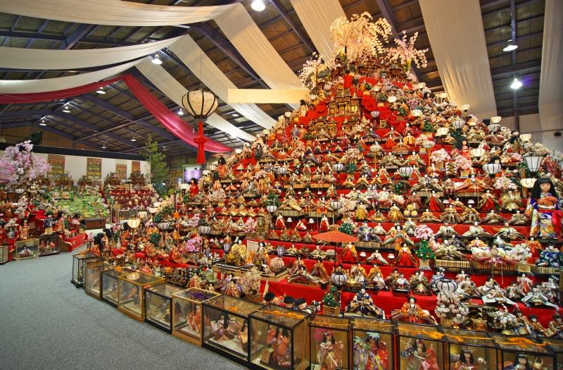 昭和63年にはじまった、「元祖」を名乗る日本一のビッグひな祭りです。会場の中央には、高さ8mのビラミッド型の百段ひな壇がそびえ、まわりに大小さまざまな300段のひな壇。全国から寄せられた3万体ほどのひな人形が飾られています。