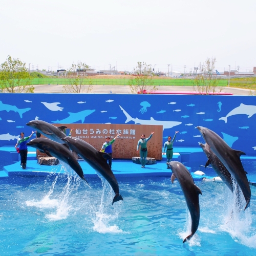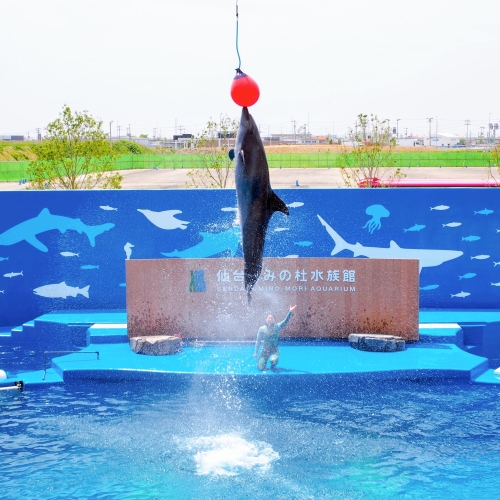 「うみの杜スタジアム」では、東北最大級のイルカ・アシカのパフォーマンスが見られます。2022年3月から内容もパワーアップし、20分のショーの中では、生きものの生態を学べるパートと、パフォーマンスで魅せるパートを交互に展開。イルカの全身を使ったダイナミックなジャンプや、スピンを楽しんで。