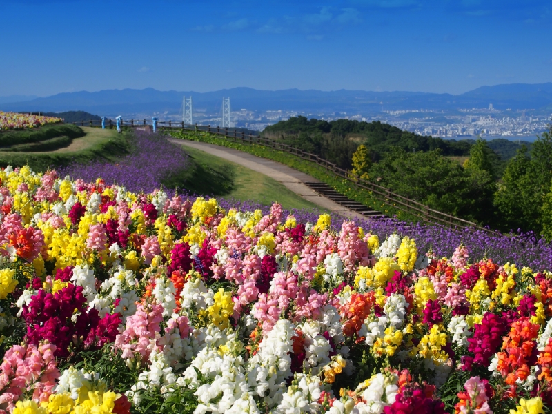 淡路島北部にある、入場無料の花の名所「あわじ花さじき」。5月下旬〜6月中旬は「キンギョソウ」、6月上旬~7月上旬には「三尺バーベナ」が見頃を迎え、「天空の小径」エリア一面がカラフルなキンギョソウと鮮やかな紫色の三尺バーベナで彩られます。