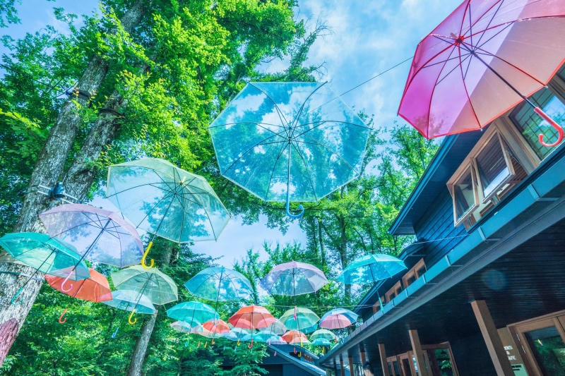 星野リゾートが運営する軽井沢の商業施設「ハルニレテラス」。例年6月上旬〜7月上旬にかけて、敷地内をカラフルな傘で彩るイベント「軽井沢アンブレラスカイ」が開催されます。