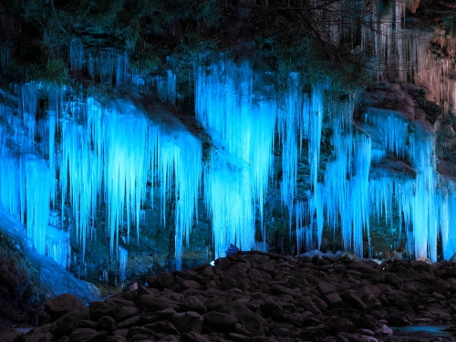 湧水による天然の氷柱のほか、人工的に作られたものもあり、3箇所それぞれが全く違う表情を見せてくれます。例年の氷柱の見頃はおおむね1月中旬〜2月中旬ごろです。
